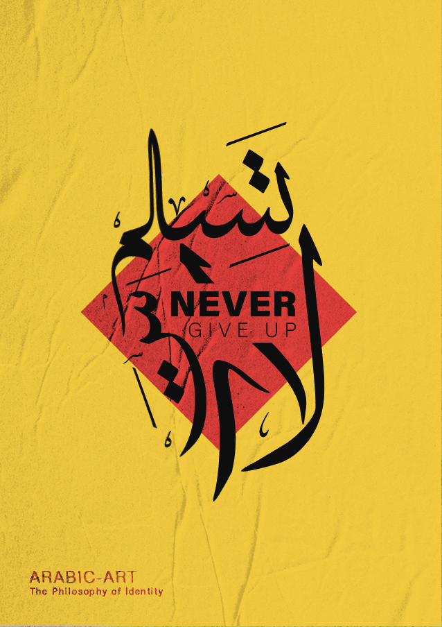 ๐ŸŸก The second artwork combines the Arabic phrase “ู„ุง ุชุณู„ู‘ู…” with the English message Never Give Up. The calligraphy is shaped with directional arrows that reflect persistence and inner strength, layered over a vibrant yellow backdrop that conveys energy and optimism.